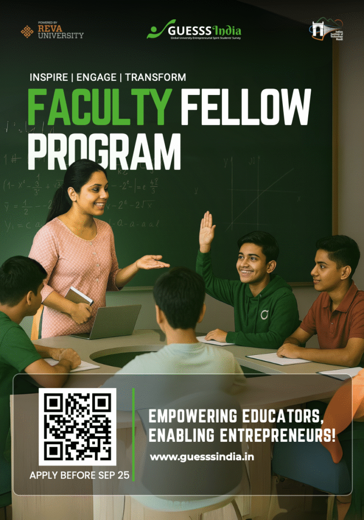 The GUESSS India Faculty Fellows Program invites faculty members from Indian higher education institutions who are passionate about entrepreneurship, innovation, and student development to join a national movement. Faculty Fellows act as key enablers of the GUESSS India mission to strengthen the culture of entrepreneurship in Indian campuses through research, engagement, and knowledge dissemination.